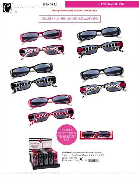 7103550 Sassy Patterned Tinted Readers 12 7103550 Sassy Patterned Tinted Readers 5 asst. • Plastic and Glass • 6 x 1 3/4 x 1 1/8 $2.75 each (30) $2.50 each (120) e © IIIIIIIIIIIIIIIIIIIIIf?D? AVAILABLE IN +1.oo +1.5o +2.oo +2.5o +3.oo MAGNIFICATIoN EACH PAIR OF GLASSES COMES IN THEIR OWN STURDY CASE G! Everyday Gift | 2017 READERS TM,© MIDWEST-CBK, LLC. ALL RIGHTS RESERVED Pricing Shown is US$ Tap Item for CA$ Price |