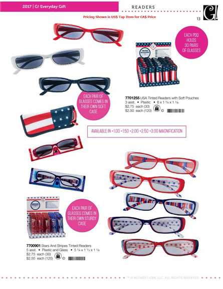 7700901 Stars And Stripes Readers (5 a 7701255 USA Tinted Readers (3 asstd). 13 2017 | G! Everyday Gift 7700901 Stars And Stripes Tinted Readers 5 asst. • Plastic and Glass • 5 1/4 x 1 1/2 x 1 1/8 $2.75 each (30) $2.50 each (120) e0 11111111111111111111111111Jill 7701255 USA Tinted Readers with Soft Pouches 3 asst. • Plastic • 6 x 1 3/4 x 1 1/8 $2.75 each (30) $2.50 each (120) e0 111111111111111111111111111111 AVAILABLE IN +1.oo +1.5o +2.oo +2.5o +3.oo MAGNIFICATIoN EACH PAIR OF GLASSES COMES IN THEIR OWN SoFT CASE EACH PAIR OF GLASSES COMES IN THEIR OWN STURDY CASE EACH PDQ HoLDS 3O PAIRS OF GLASSES READERS TM,© MIDWEST-CBK, LLC. ALL RIGHTS RESERVED Pricing Shown is US$ Tap Item for CA$ Price |